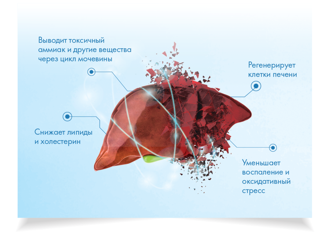 Обеспечивает выведение токсических веществ, регенерацию клеток печени, уменьшает воспаление и накопление жира в печени.